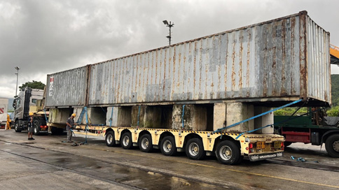 Wangfoong (Hong Kong) delivered the modules for a waste treatment centre during new year to 2024. Considering the road limit and cost effectiveness, we arranged derrick barge for collecting containers from terminal to the designated wharf and transloading to trailer at the wharf for further inland delivery to the site.