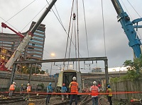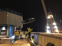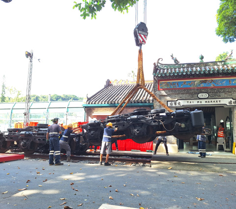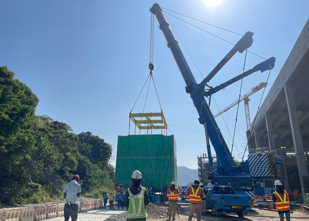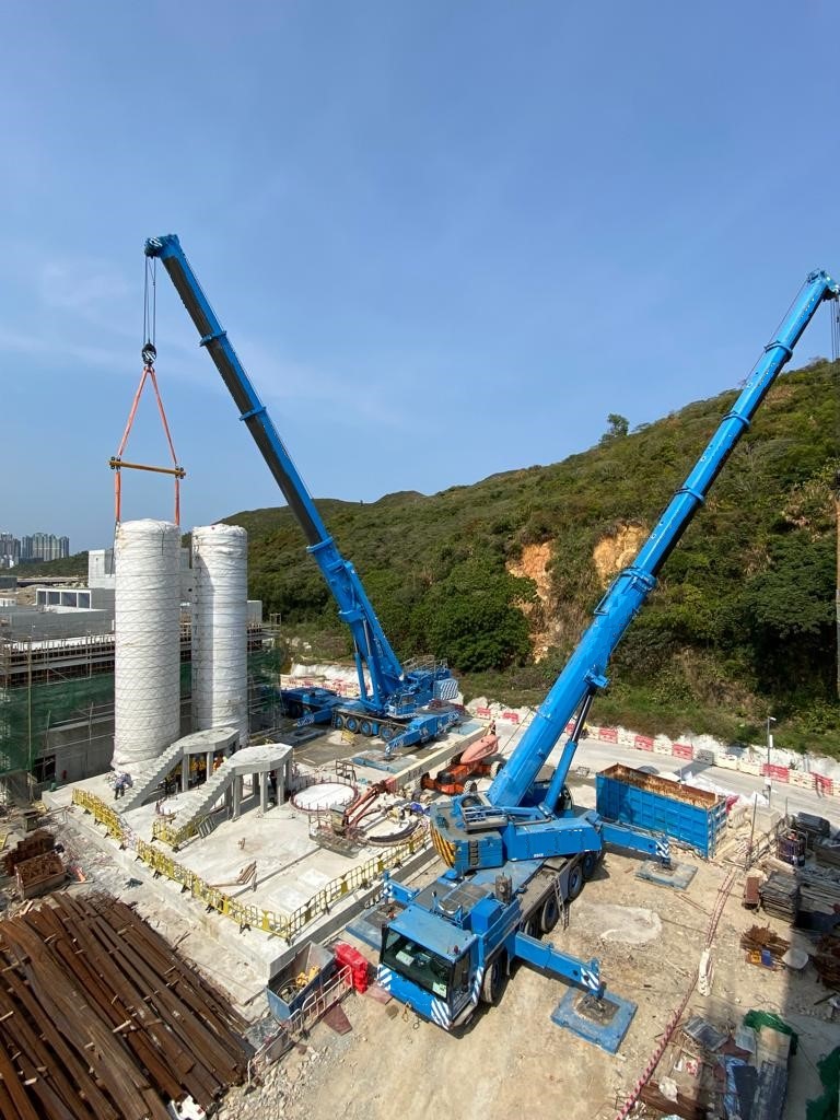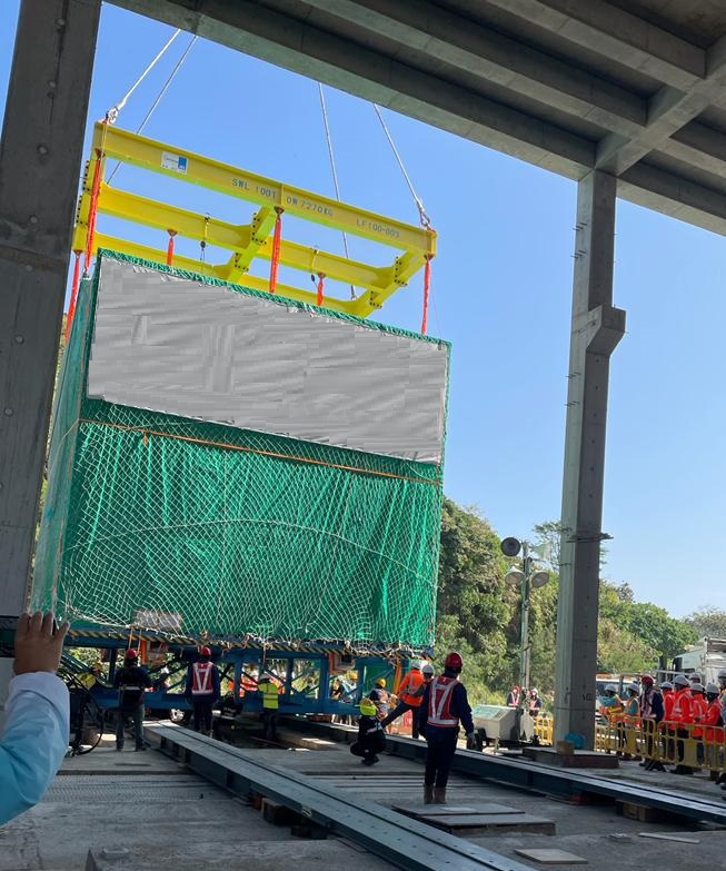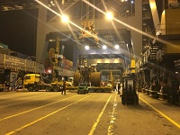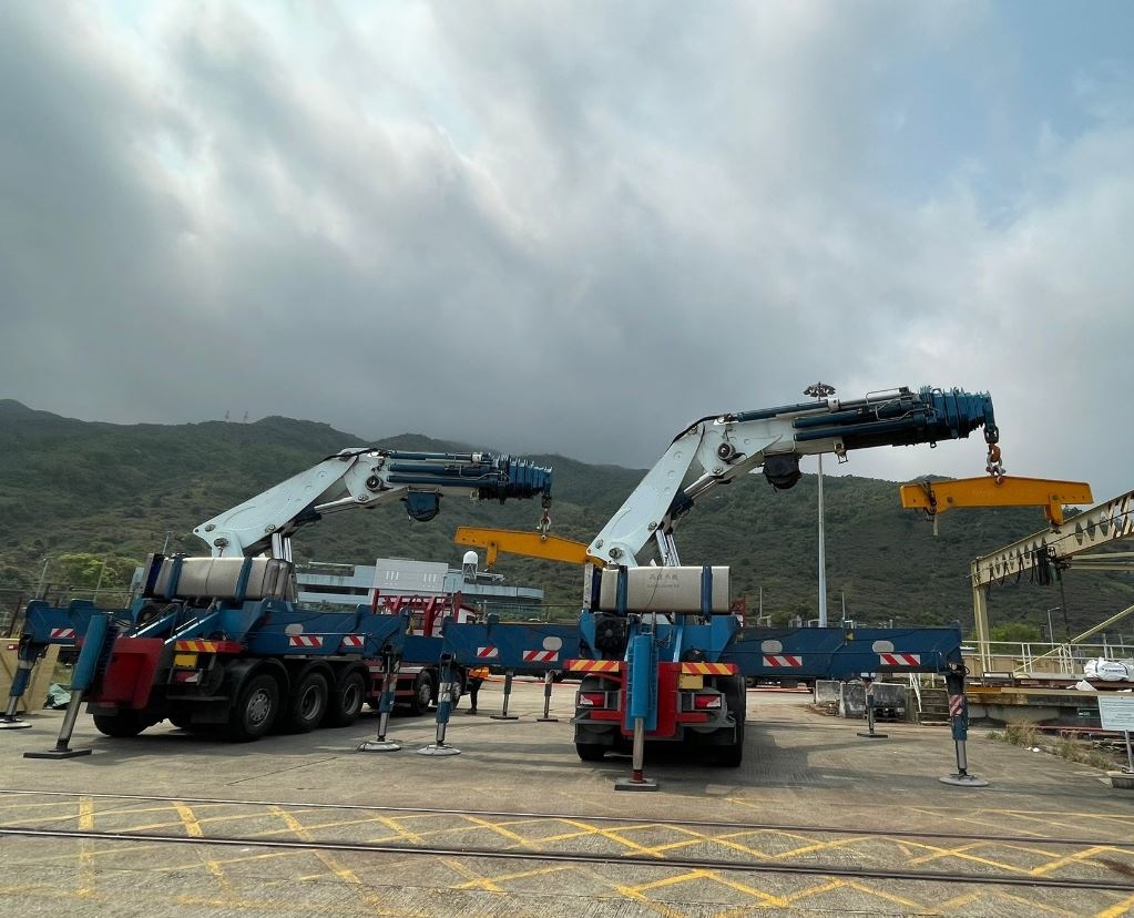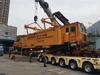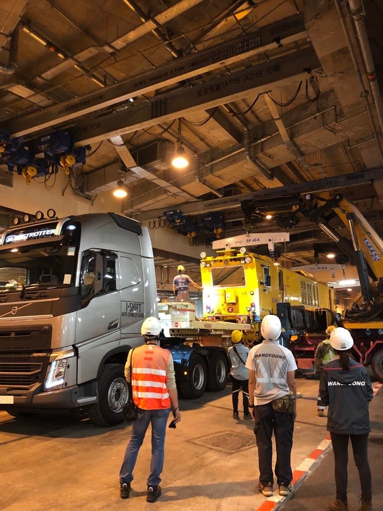 To relocate the over-weight and over-size rail grinder machine to MTR depot, where the unloading area is with limited headroom and space that special tandem lifting is needed. Wangfoong arranged night transportation with convoy operation, with hydraulic trailer equipped with adjustable steering system. Two units of lorry cranes were utilized to perform tandem lifting at MTR depot, and necessary road permit applied for over-weight and over-size transportation and tailor-made spreader beam for lifting. We also prepared documents with method statement with detailed calculations and drawing to make sure detailed planning is in place.
