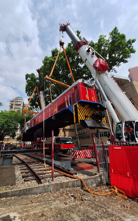 TThis operation for 3 wagons of maximum weight of 46,000kgs were turned around by heavy-lift telescopic mobile crane. The most challenging part was the operation to be done in limited space and avoided overhead cablesinside the train depot. The operation was done within one day.