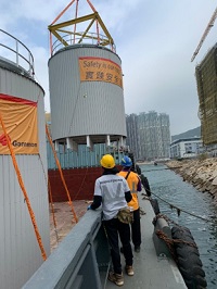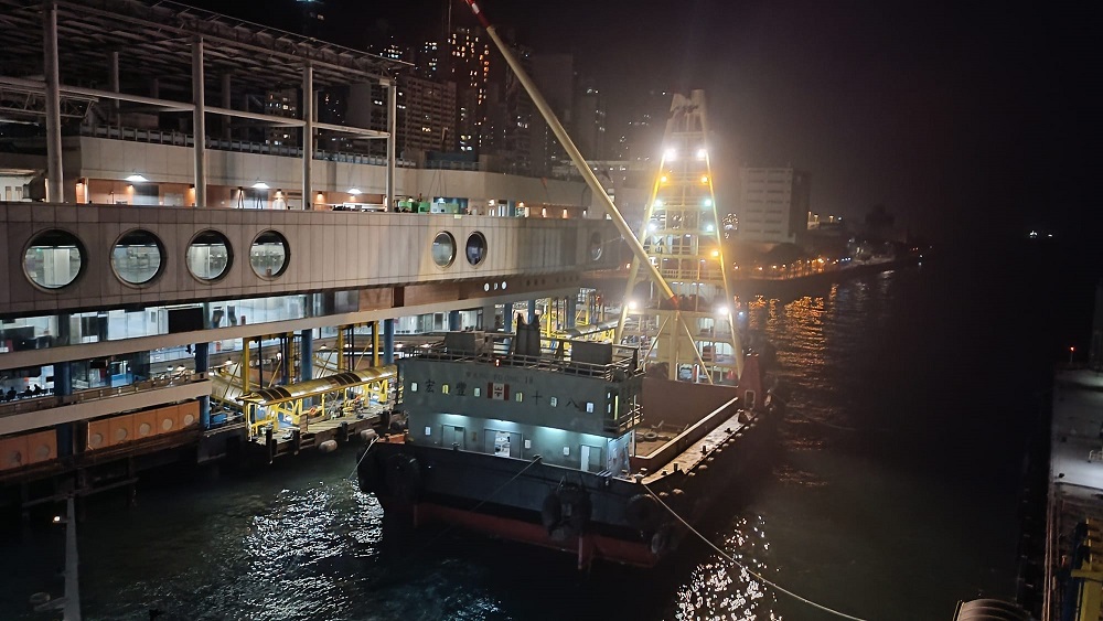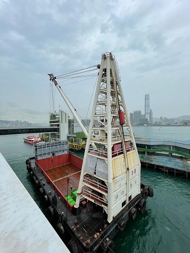 Wangfoong managed to lift existing chiller plants, delivery of new chiller plants by barge and provided riggers and tools for positioning of chillers into plant room. Due to site constraint, the delivery of chillers could only be done by derrick barge, from waterside onto upper deck level for positioning into plant room.Swinging situation on sea was one of thedifficulties in the operation. With close supervision by Marine Department, Wangfoongcompleted the operation within limited time during mid-night.