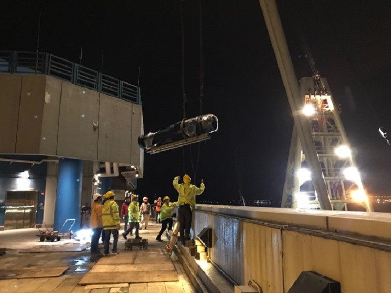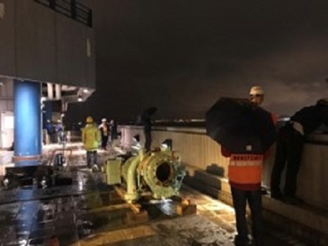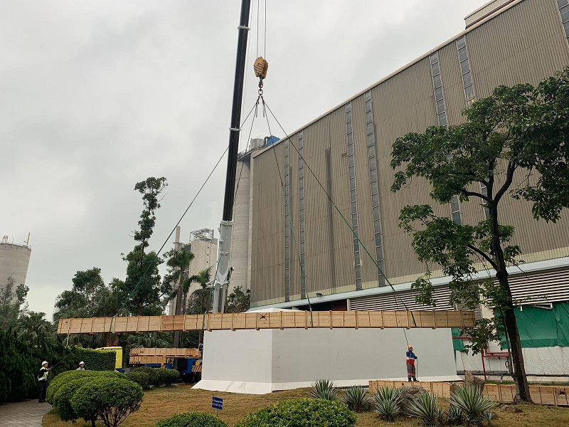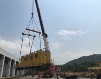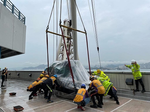 The operation needed to be performed along seaside during monsoon season, under supervision of clients and Marine Department. Instead of using mobile cranes, our transport team managed to operate with a derrick barge, lifting the cargoes from seaside onto upper deck level then positioned into the plant room. The job was completed under sufficient lighting, experienced signalman and riggers provided by Wangfoong. The whole operation was approved and was closely monitored by Marine Department.