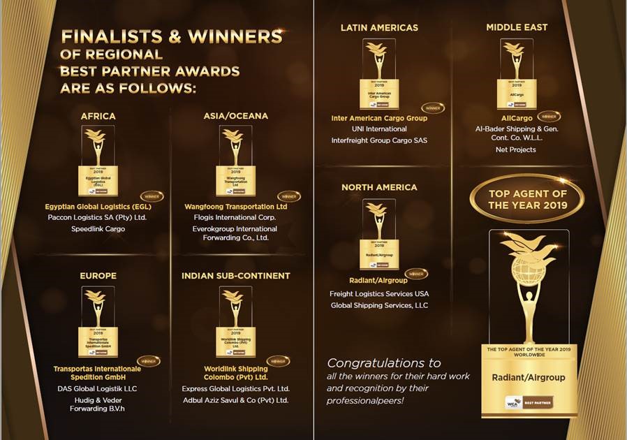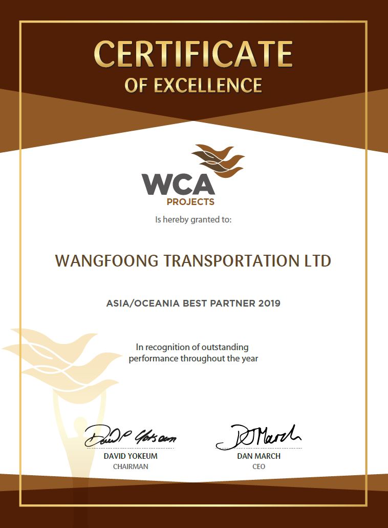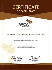 Wangfoong Transportation has been awarded as the Best Partner in Projects in Asia / Oceania 2019. As being recognized by renowned projects network ¡V WCA Projects (https://www.wcaprojects.com/Home), we are proud to serve our best with professional works and passions, and will continue to contribute to all partners who put their trust on us. We will move forward under the pandemic and assist whatever and whenever we can.