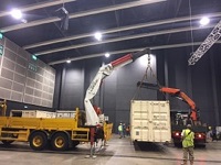 - Unloading cargo by crane lorry equipped with tailor made spreader frame inside the covered warehouse